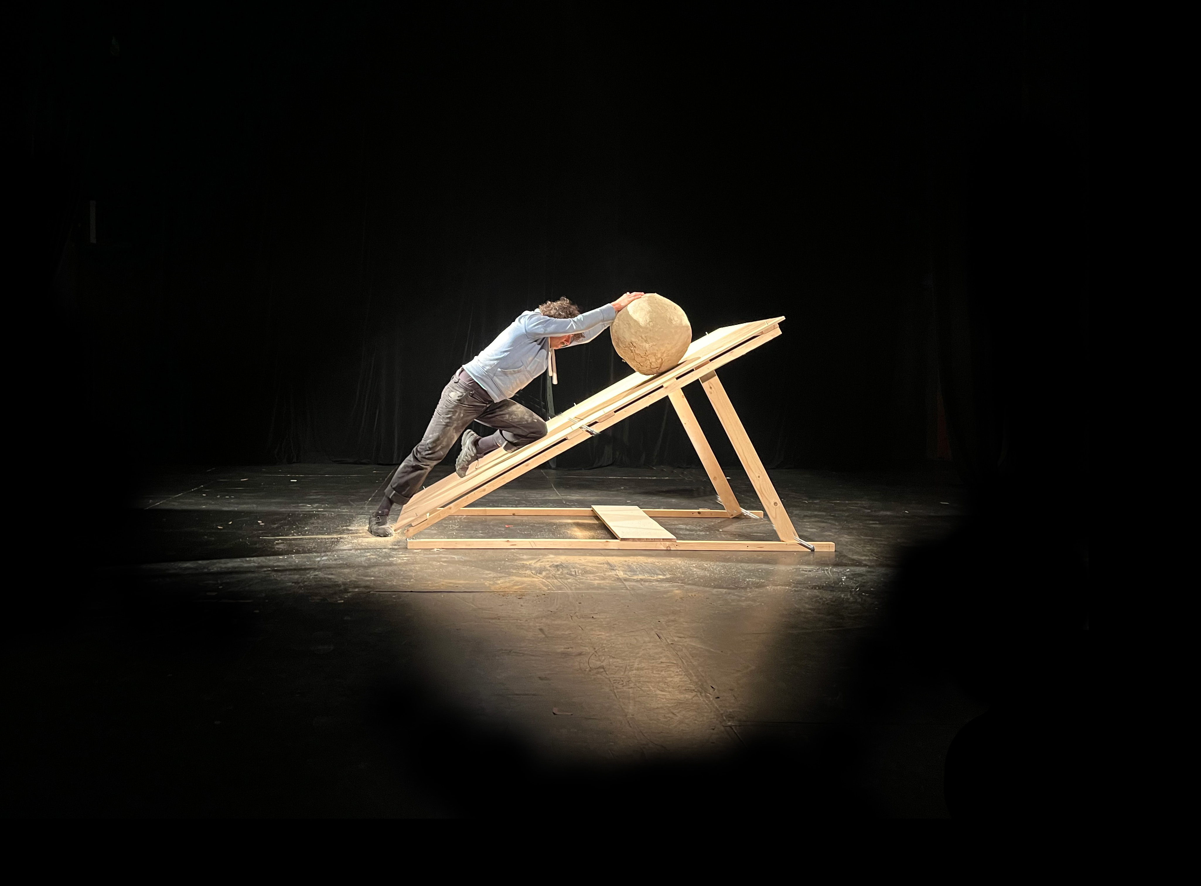 Pour mettre en scène cette confrontation entre l’épique humaine et l’épique minérale, nous proposons trois éléments sur scène : un homme, un caillou et une pente.